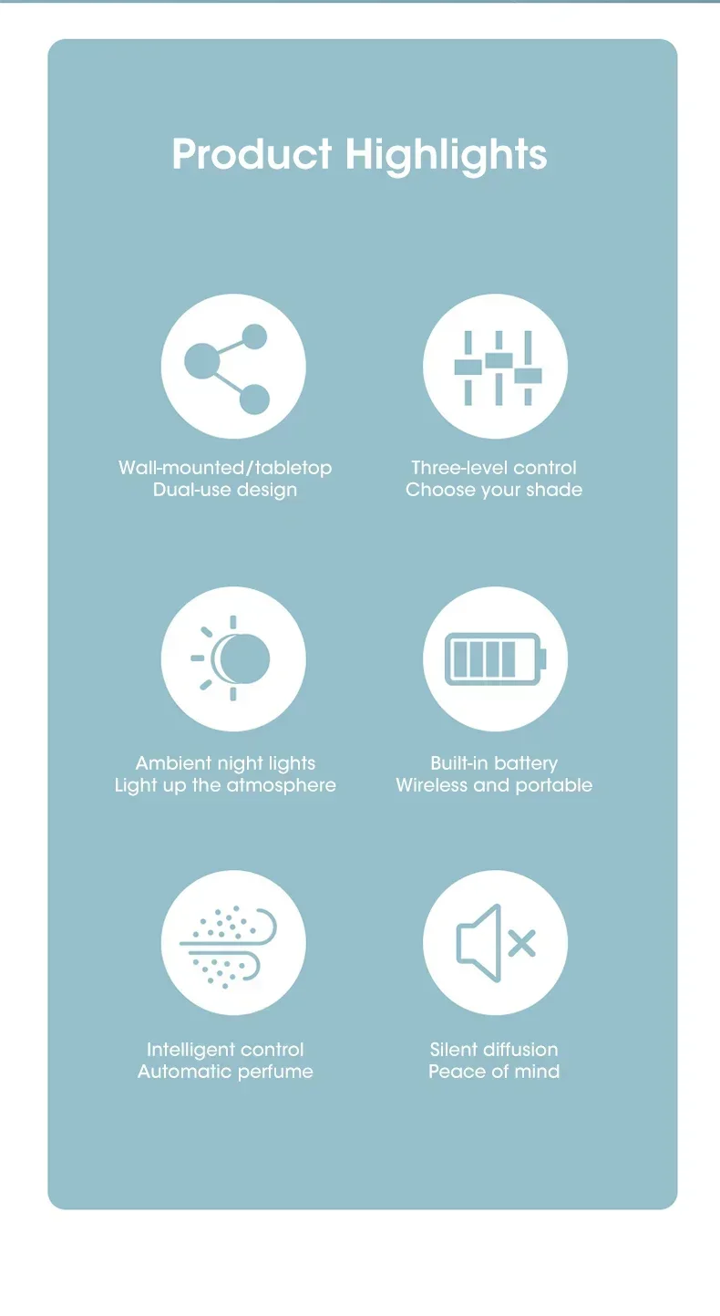 * Diffuser Machine Built-in Battery, it's portable and long battery life.